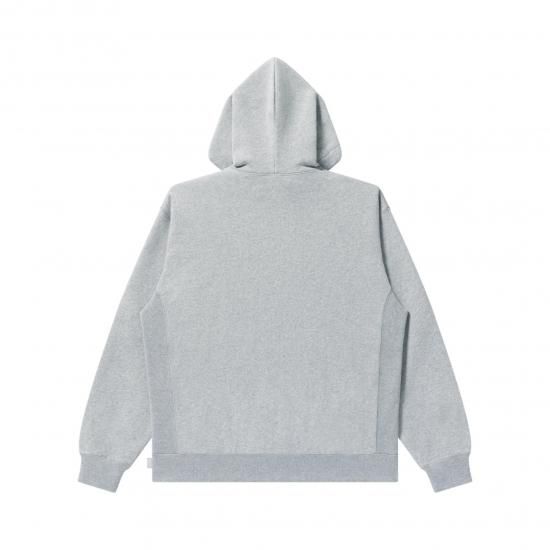 ステッチで表現した "OG LABEL" と "取扱注意" を発泡プリントしたプルオーバーフーディ。