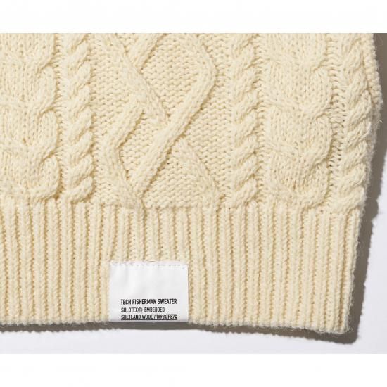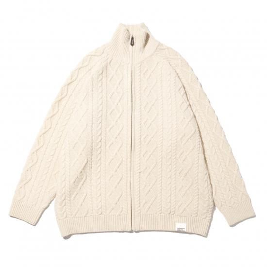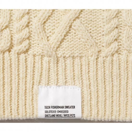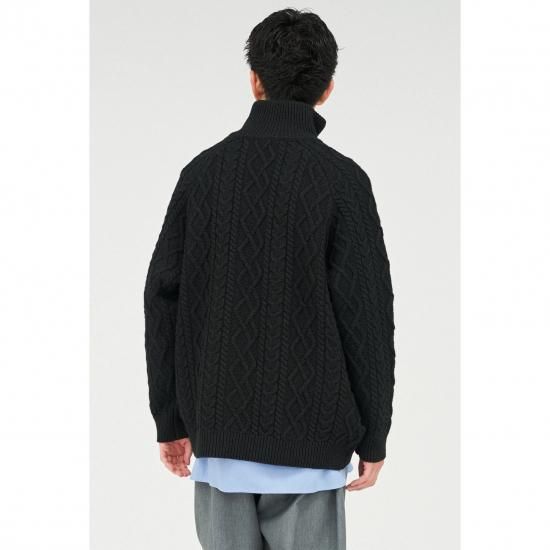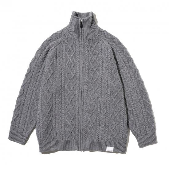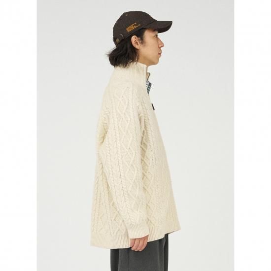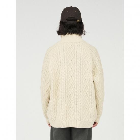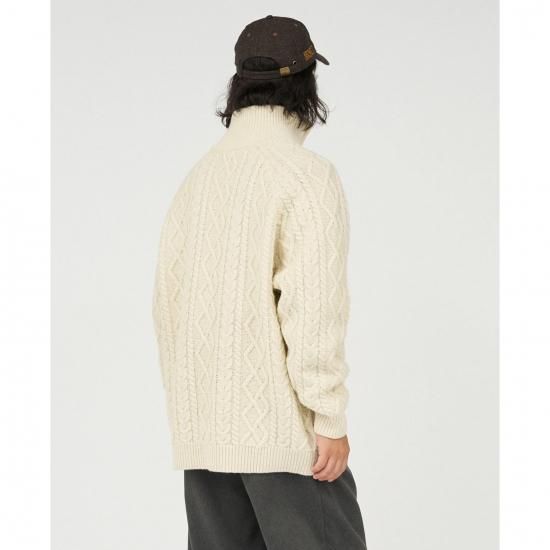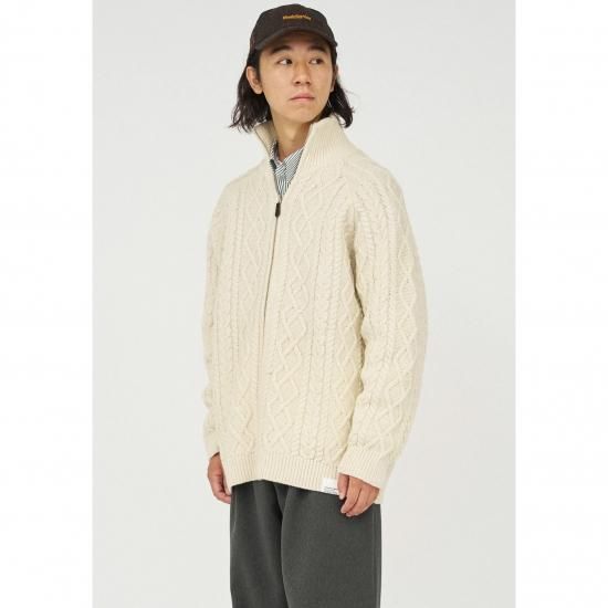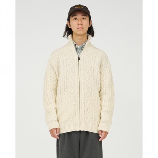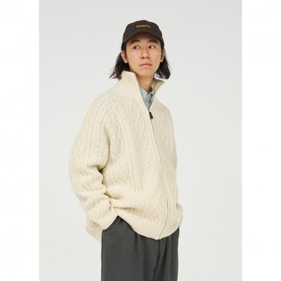 現代的にアップデートした、伝統的なアラン編のフィッシャーマンセーター。素材本来の風合いを活かしながら伸縮性や形態安定性を付与することができるSOLOTEX糸は、一部に植物由来原料を使用しており、地球環境にも配慮した素材です。そのSOLOTEX糸でシェットランドウールをカバーリングすることで、ウール本来の暖かさみのある風合いはそのままに機能性を持たせたハイブリットな一着に仕上げました。FreshServiceらしいゆとりのあるシルエットのジップアップは、羽織としても中間レイヤーとしても活躍する汎用性の高い一枚です。