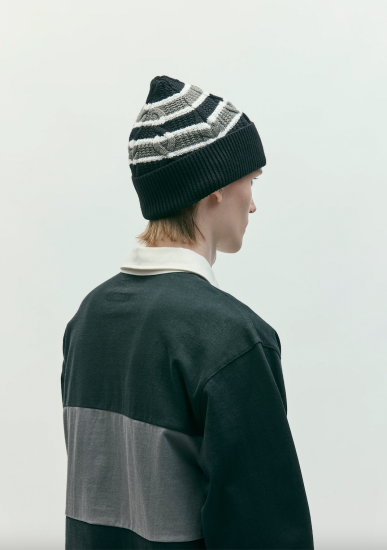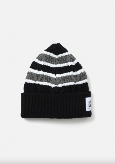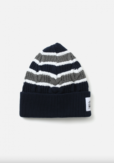 コットン糸で編み立てたボーダー柄のケーブルニットを使用したビーニー。フロント折り返し部分にコラボレーションネームを配置。1920年創業のアメリカ・シアトル発アウトドアブランドEddie Bauerとのジョイントワークアイテム。